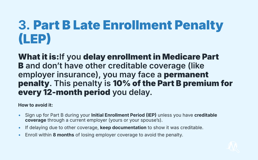 What it is:If you delay enrollment in Medicare Part B and don’t have other creditable coverage (like employer insurance), you may face a permanent penalty. This penalty is 10% of the Part B premium for every 12-month period you delay.